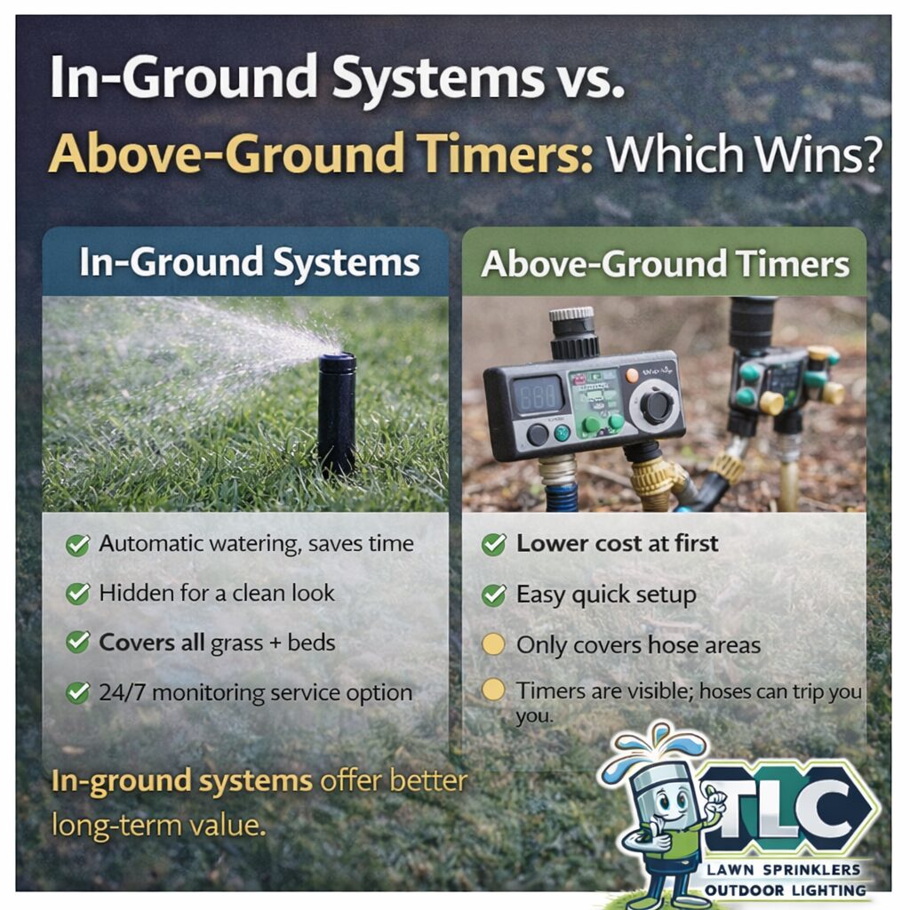 Here’s the honest truth: Above-ground timers and hoses can work for some properties. But there’s a reason in-ground systems are what we install 95% of the time at TLC.
